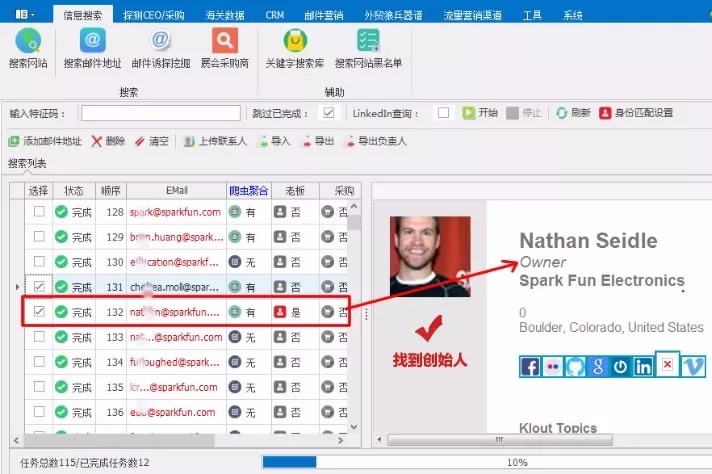 通過外貿(mào)狼挖到很多這個企業(yè)相關的郵箱,還沒有停止,這個時候還沒有知道到底哪個郵箱對應是誰,要解開這些郵箱的面紗,我們外貿(mào)狼目前已經(jīng)打通了全球218個社交平臺,一鍵身份探索秒秒鐘幫您精準定位這些郵箱對應人的身份,老板??!采購啊!市場經(jīng)理!身份亮起來!他們的LinkedIn、Facebook、Twitter等社交賬號,通通給你。連這個老板,今天吃什么,昨天去哪里,你都知道了,你還愁沒有話題給客戶寫開發(fā)信嗎?還愁客戶不給你回郵件嗎?