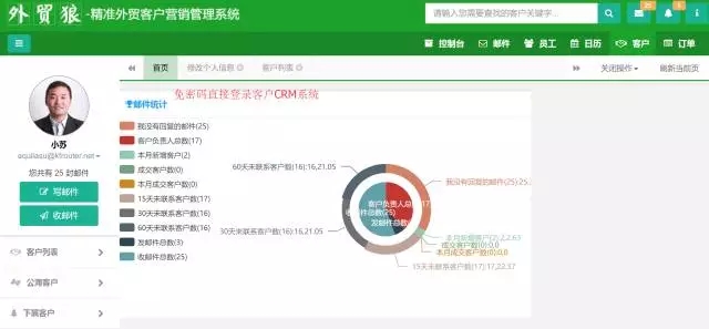 精準客戶的郵箱、社交賬號通通都找到了,我們外貿(mào)狼還在軟件中打通了客戶管理CRM系統(tǒng),找到聯(lián)系人后,勾選你看中的老板,采購一鍵存儲到客戶管理CRM系統(tǒng)中,快速建立企業(yè)精準客戶數(shù)據(jù)庫,然后對客戶進行分類編輯,設置七劍法提醒,進行持續(xù)的跟進和維護。對業(yè)務員而言,提高他們的工作效率,提高他們的客戶轉化率,多賺美元;對老板而言,及時了解員工的工作績效,方便管理,方便考核,及時員工跟進客戶的情況,及時發(fā)現(xiàn)員工工作中存在的問題,及時指出,幫其成長,提升團隊的戰(zhàn)斗力。