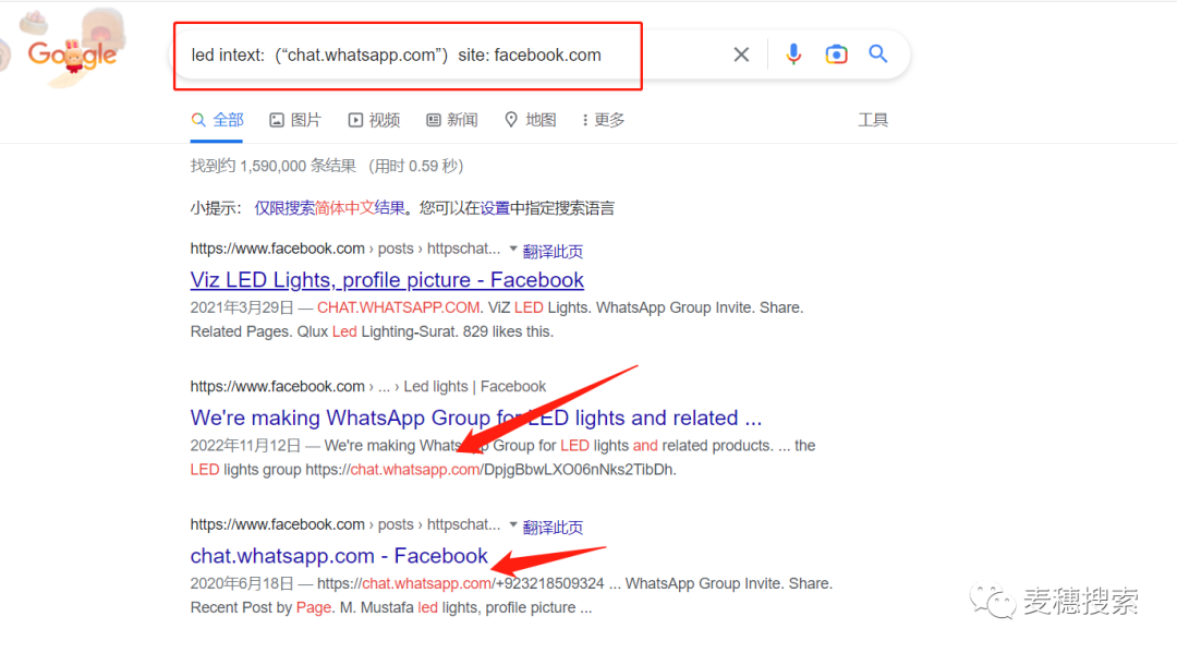 想要更細節(jié)的話,可以從Facebook的帖子中搜索,可以輸入:led intext:(“chat.whatsapp.com”)inurl:posts site:facebook.com